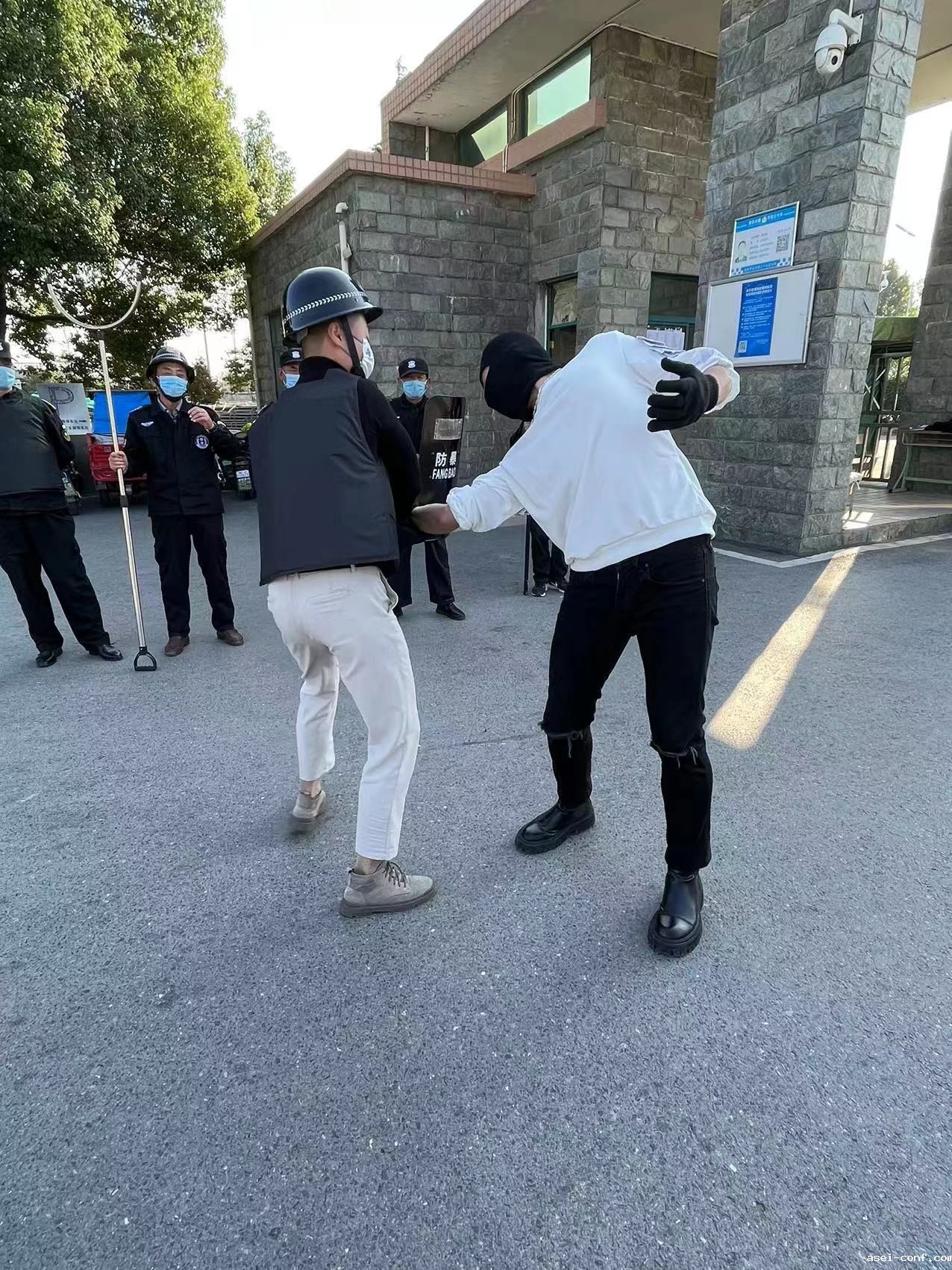 反恐防暴演练模拟场景:10月13日下午三点,校外一名男子因情绪波动,在校门叫嚣,并手持凶器闯入校园,保安警告无果后,立即启动一键报警装置(模拟)向公安机关报告,同时向学校保卫处报告。在岗执勤保安立即手持钢叉、盾牌、防刺手套等与之周旋,对歹徒进行劝阻,直至制服歹徒。